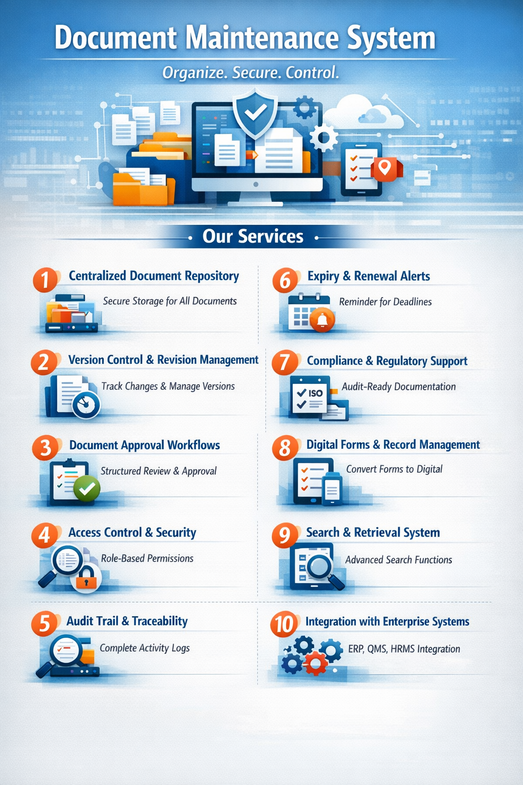 Our Document Maintenance System (DMS) is designed to efficiently manage, store, track, and control organizational documents in a secure digital environment. It ensures proper documentation, version control, compliance management, and easy retrieval of critical records across departments, improving operational transparency and regulatory readiness.
