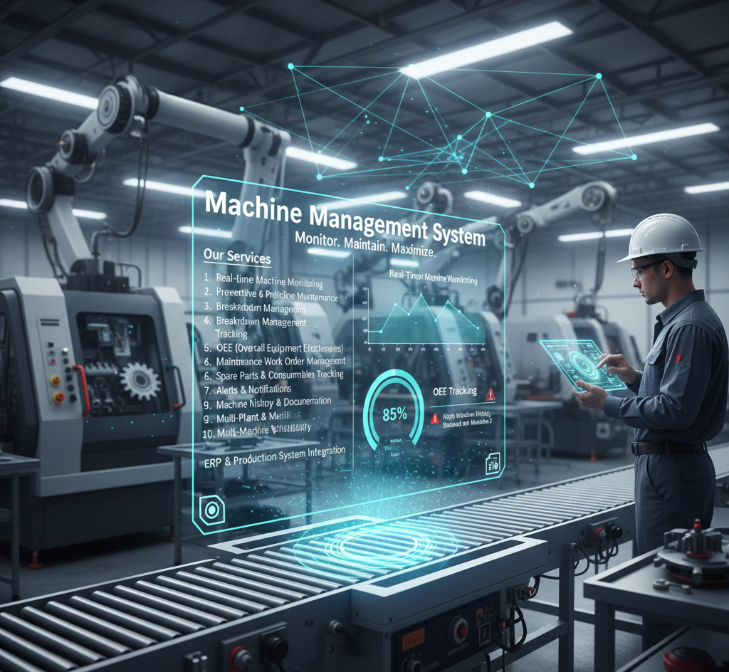 Our Machine Management System (MMS) is designed to provide complete visibility and control over machine performance, maintenance activities, and operational efficiency. It helps organizations reduce downtime, improve equipment reliability, and extend asset lifespan through intelligent monitoring and data-driven insights.
